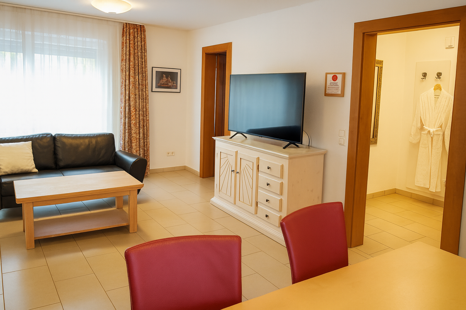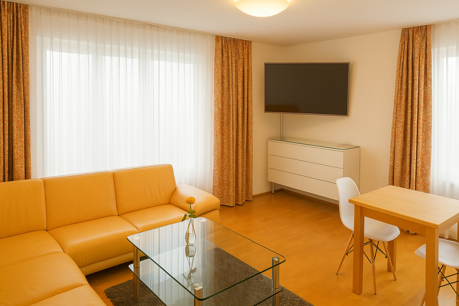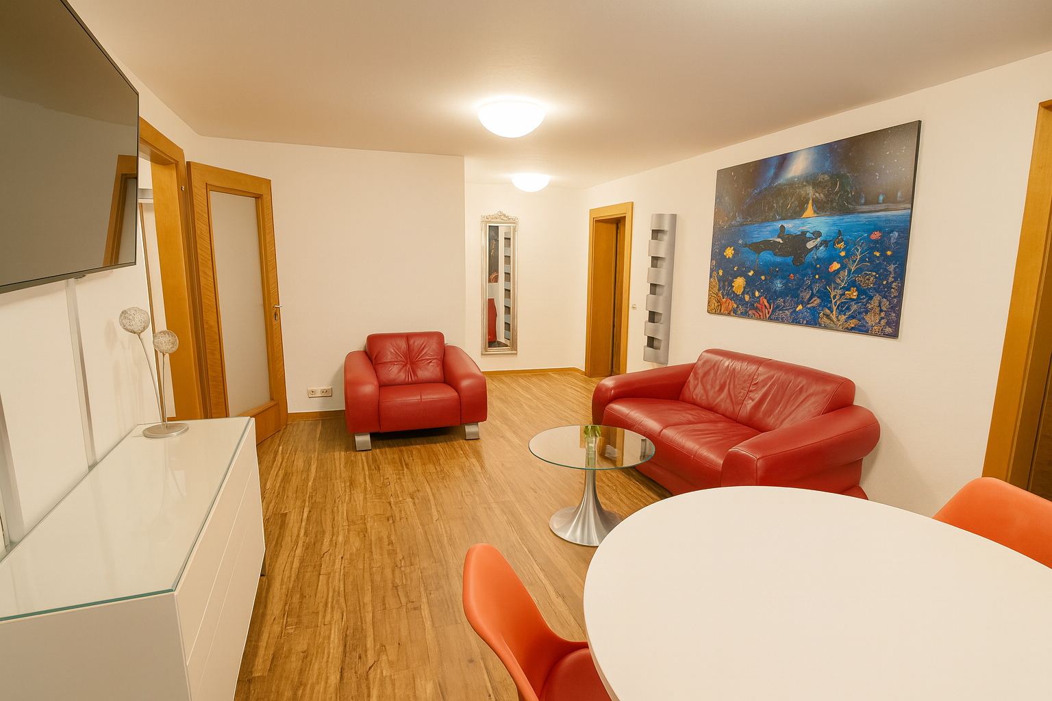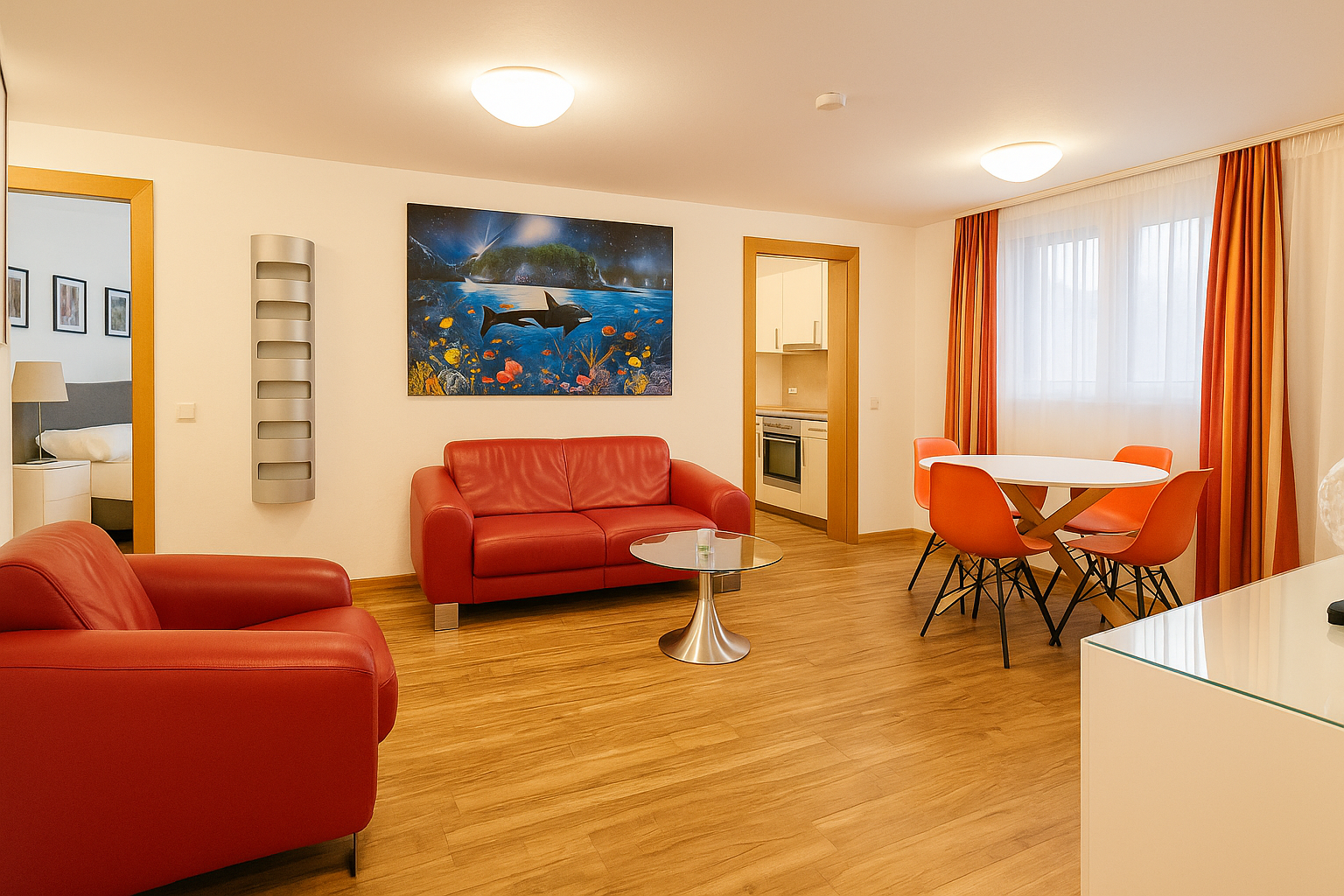 Auf 70 m² Wohnfläche erwartet Sie ein Apartment mit separatem Schlafzimmer, einem stilvoll eingerichteten Wohnzimmer, einer voll ausgestatteten Küche und einem modernen Bad. Dank der clever geplanten Raumaufteilung entsteht ein helles und einladendes Ambiente – perfekt für zwei Personen, die Wert auf Komfort legen.