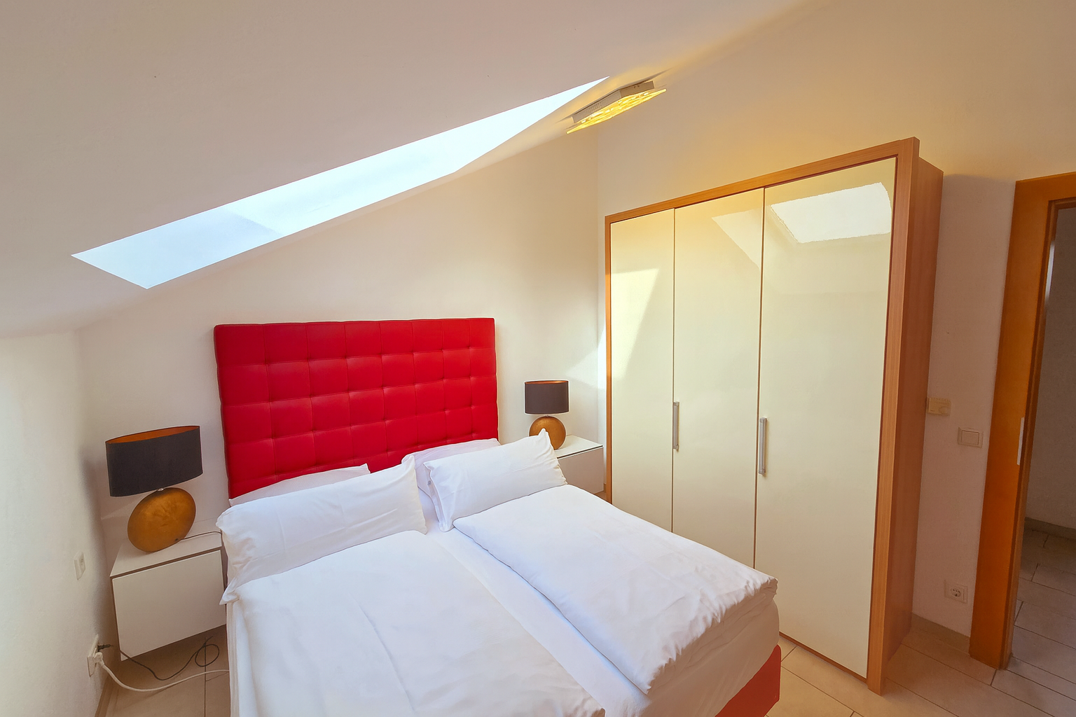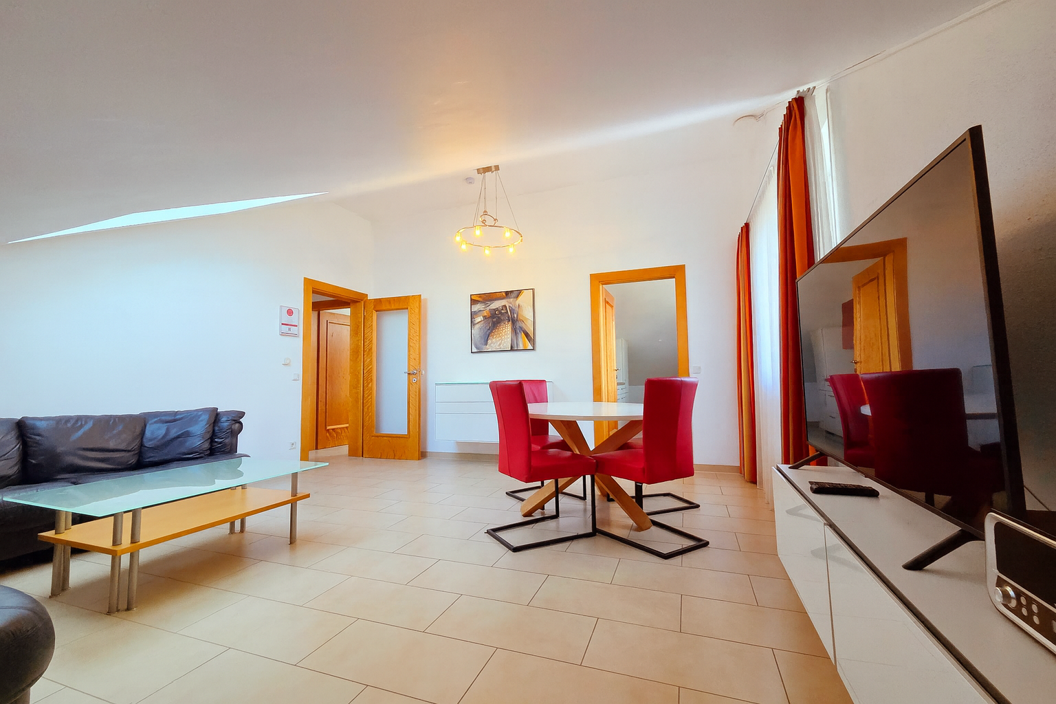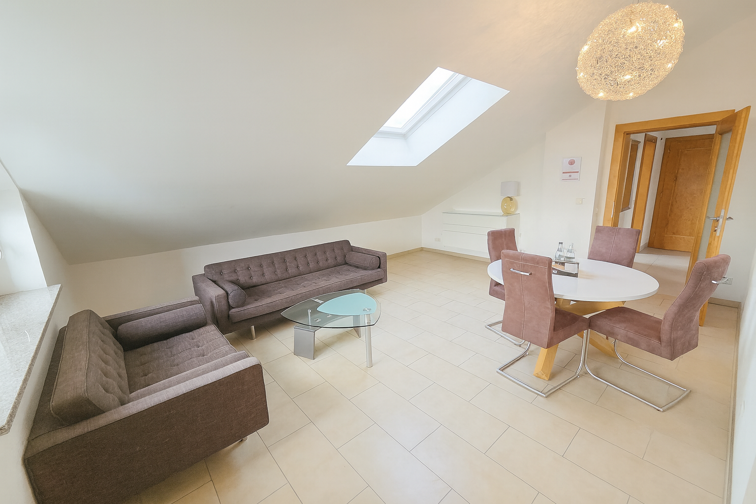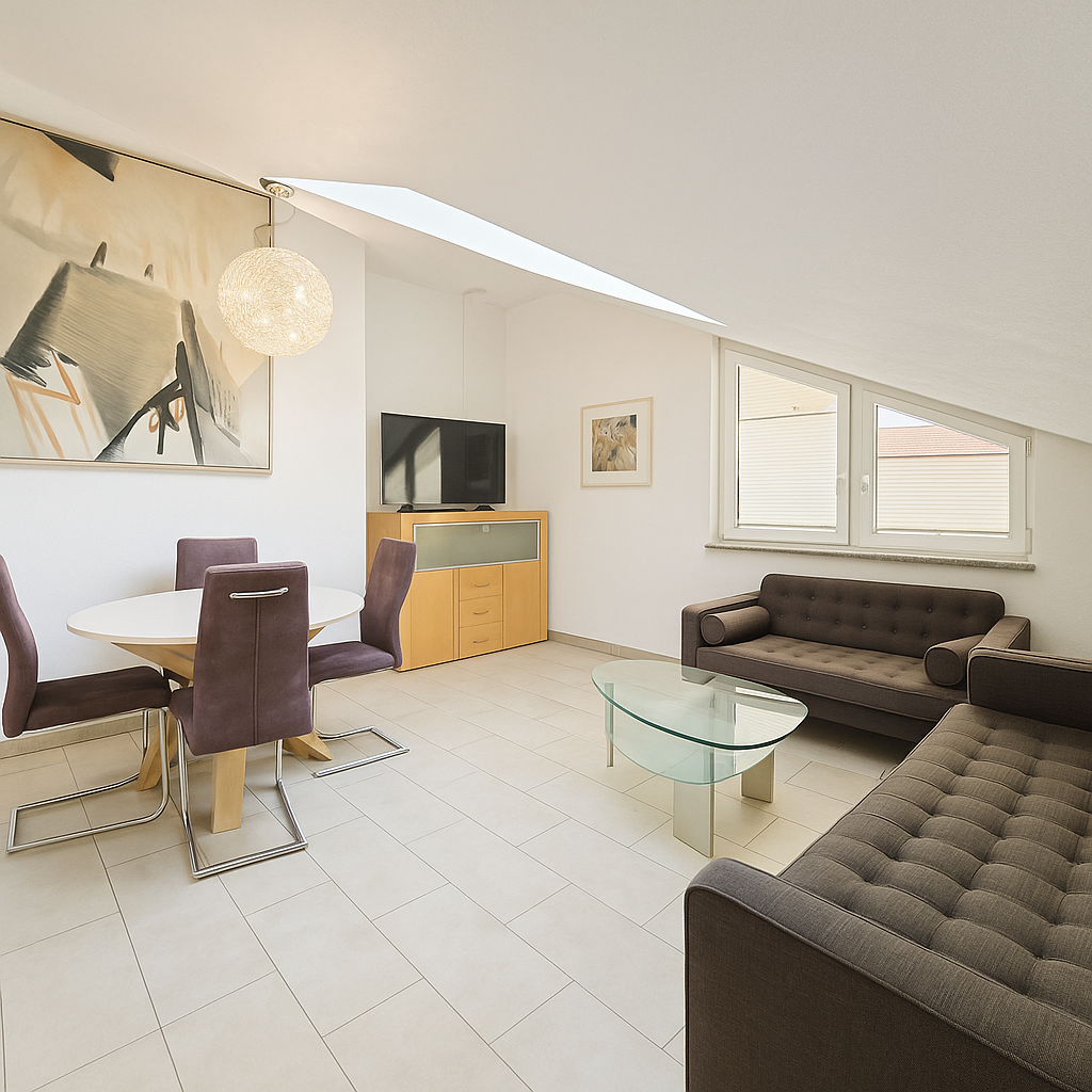 Diese 60 m² große Dachgeschosswohnung bietet ein Schlafzimmer, ein großzügiges Wohnzimmer, eine voll ausgestattete Küche und ein modernes Bad. Die offene Raumgestaltung sorgt für ein komfortables Wohngefühl, und dank moderner Dämmung sowie effizienter Temperaturregelung bleibt die Wohnung auch an warmen Tagen angenehm kühl – ideal für zwei Personen.
