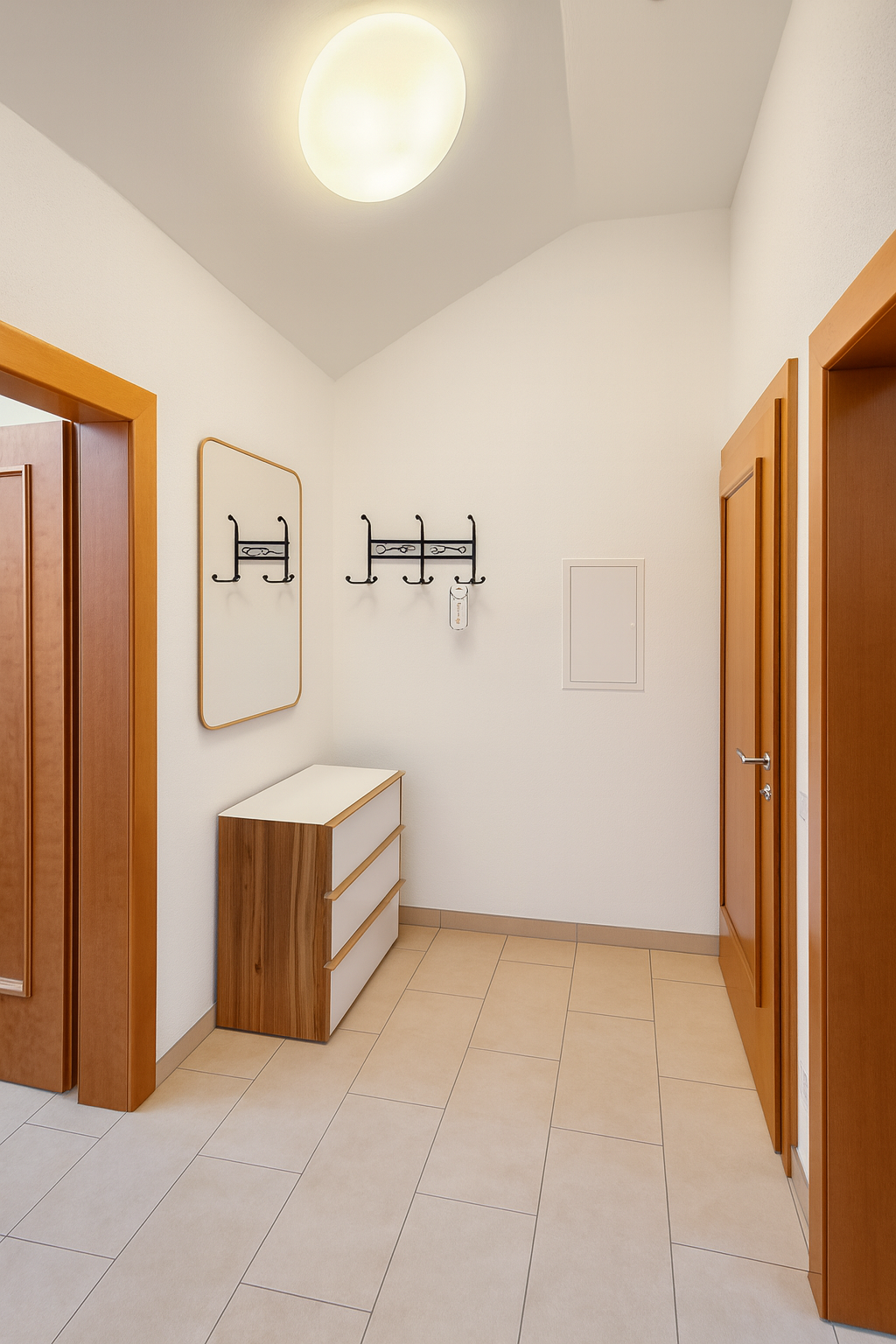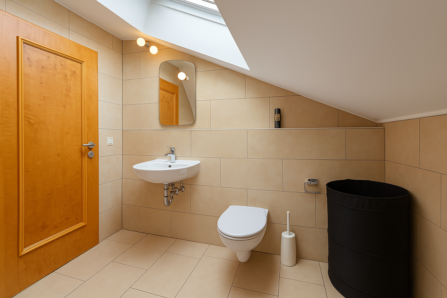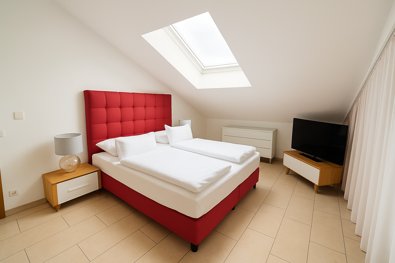 Diese 60 m² große Dachgeschosswohnung bietet ein Schlafzimmer, ein großzügiges Wohnzimmer, eine voll ausgestattete Küche und ein modernes Bad. Die offene Raumgestaltung sorgt für ein komfortables Wohngefühl, und dank moderner Dämmung sowie effizienter Temperaturregelung bleibt die Wohnung auch an warmen Tagen angenehm kühl – ideal für zwei Personen.