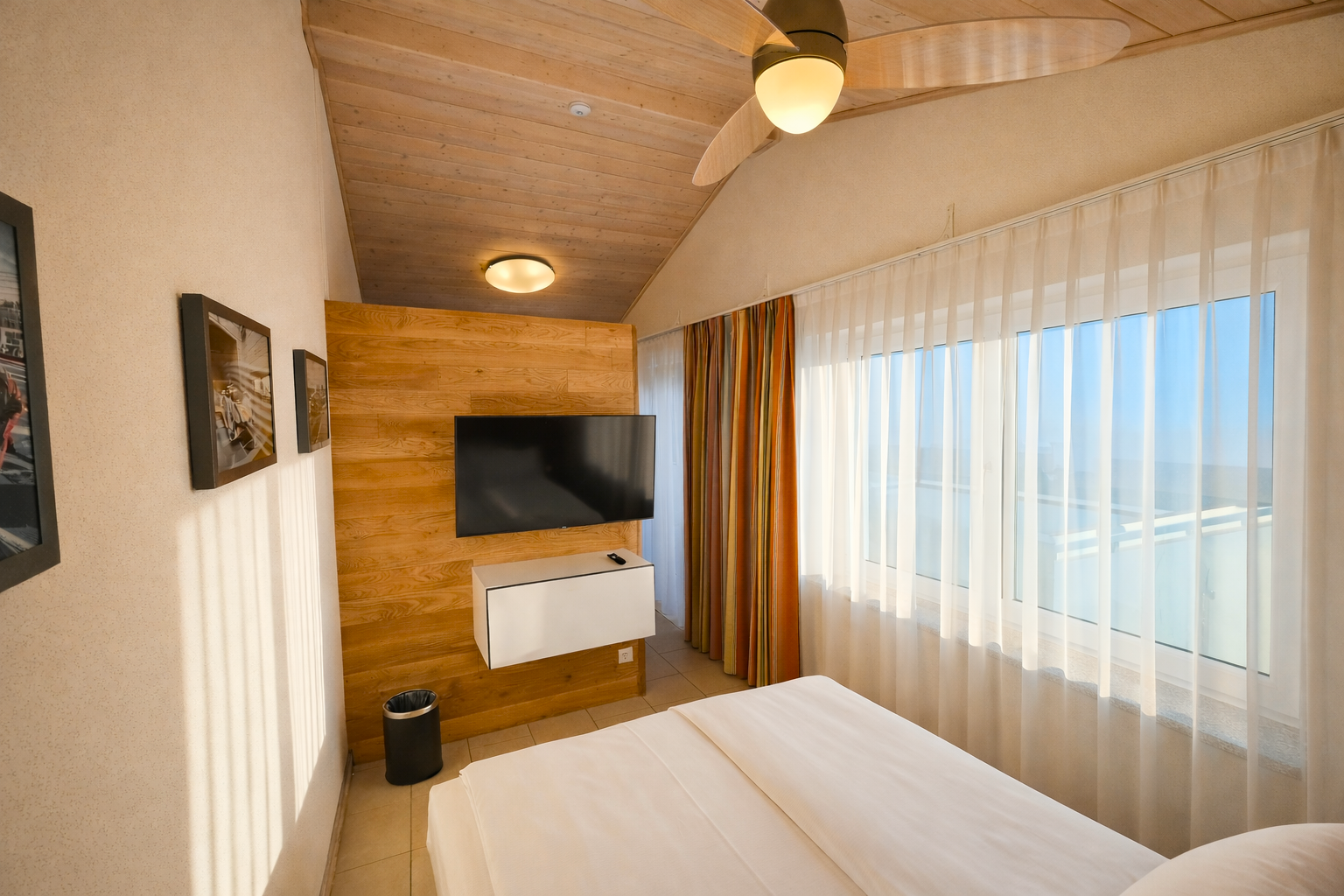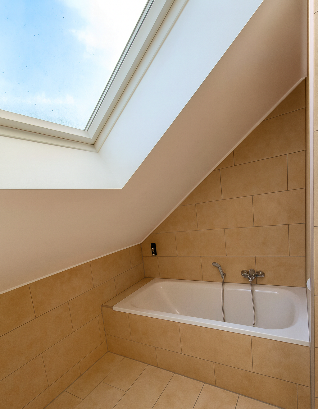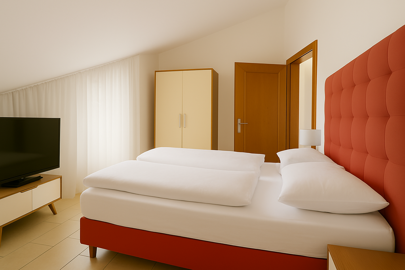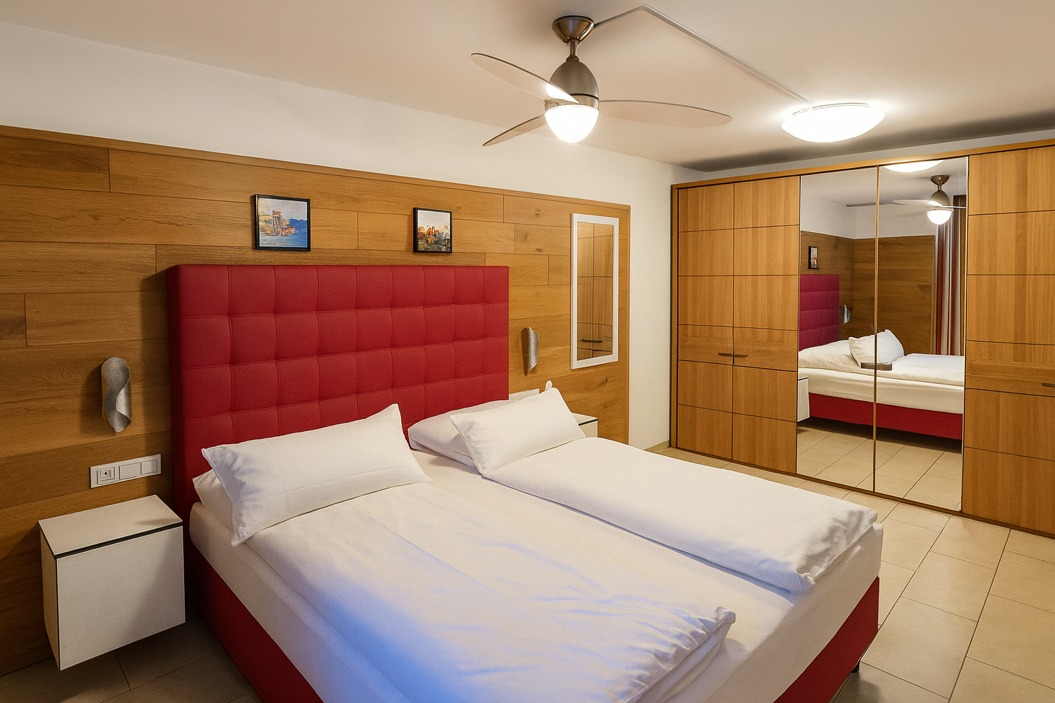 Diese 60 m² große Dachgeschosswohnung bietet ein Schlafzimmer, ein großzügiges Wohnzimmer, eine voll ausgestattete Küche und ein modernes Bad. Die offene Raumgestaltung sorgt für ein komfortables Wohngefühl, und dank moderner Dämmung sowie effizienter Temperaturregelung bleibt die Wohnung auch an warmen Tagen angenehm kühl – ideal für zwei Personen.