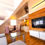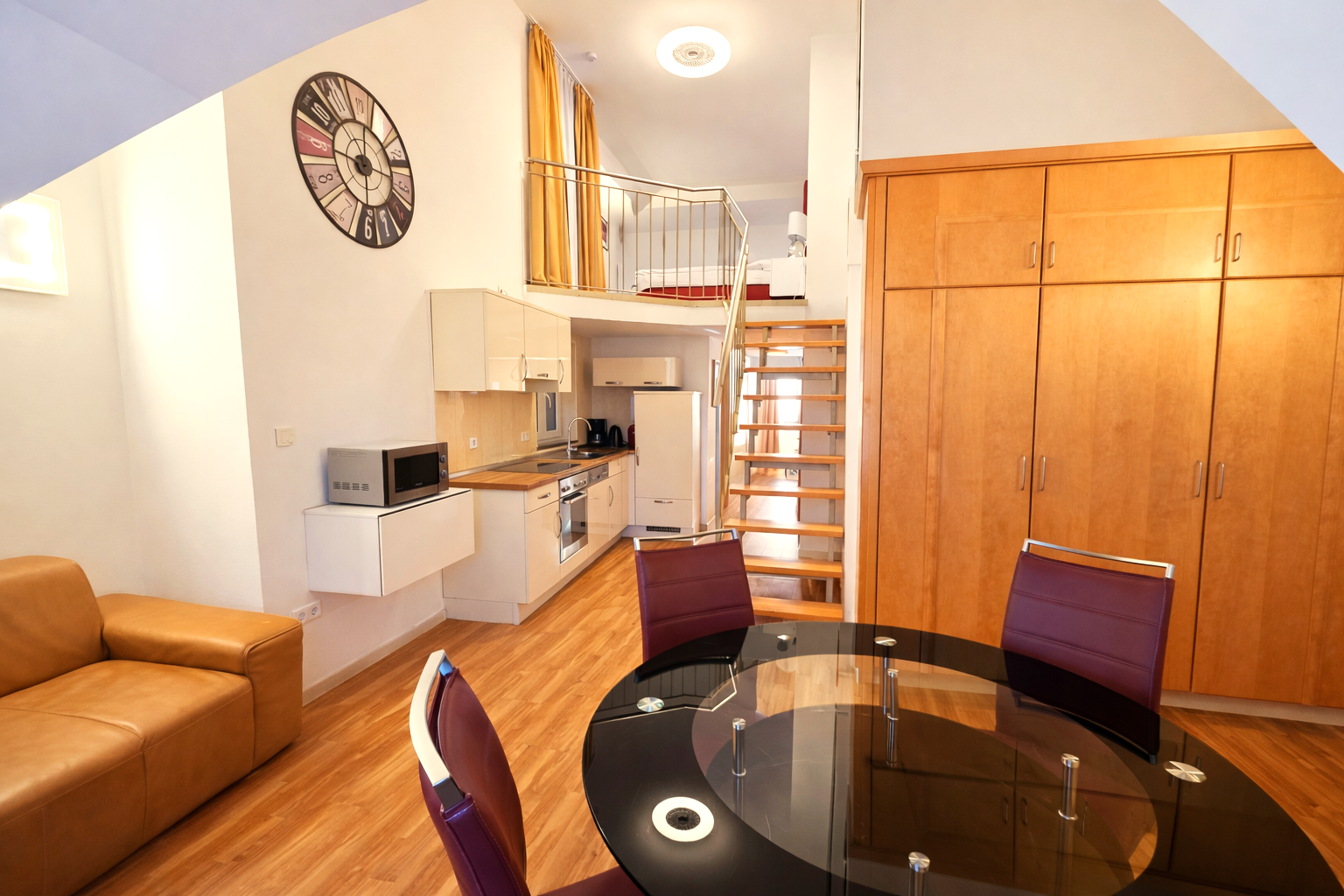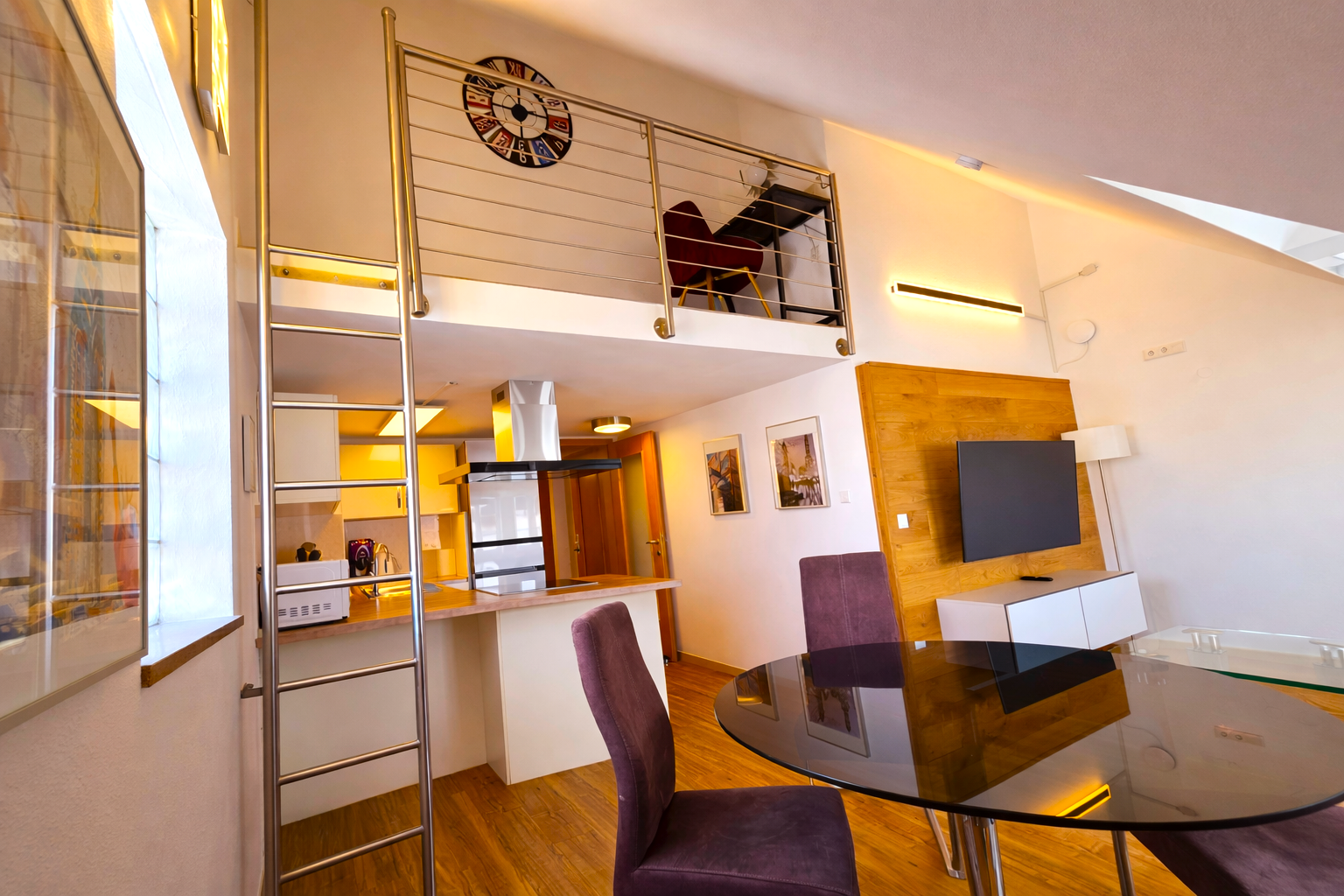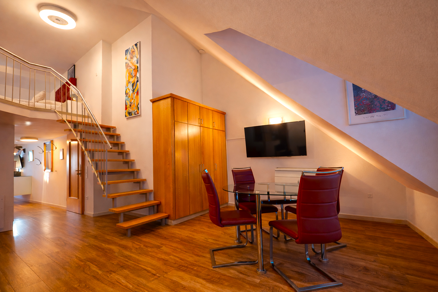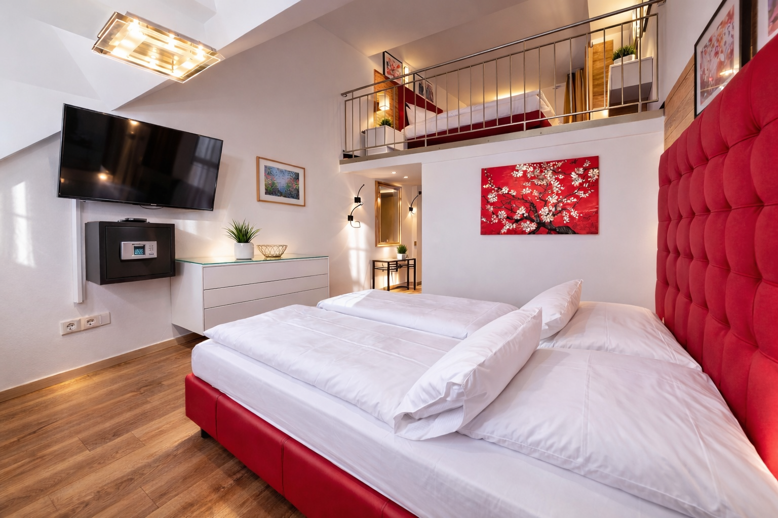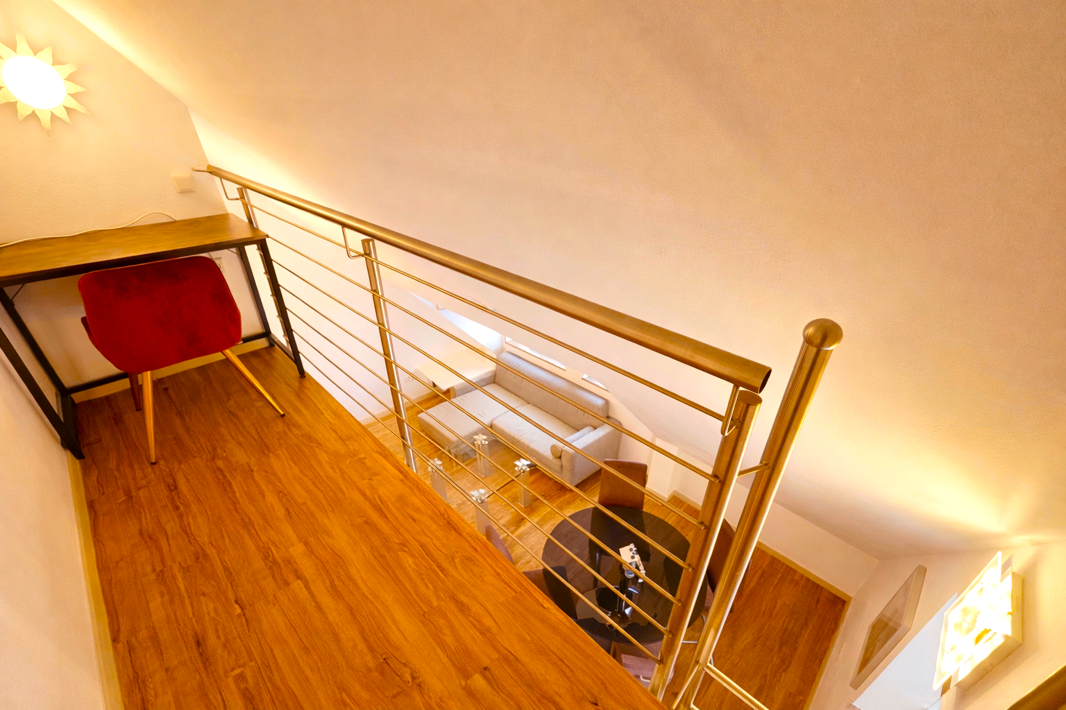 Auf 70 m² Wohnfläche erstreckt sich dieses moderne Apartment über zwei Ebenen und bietet ein separates Schlafzimmer, ein stilvoll gestaltetes Wohnzimmer, eine vollständig ausgestattete Küche sowie ein modernes Bad. Die offene Galerie im Obergeschoss dient als ruhiger Arbeitsbereich mit Schreibtisch und schafft zusätzlichen Raum zum Zurückziehen. Das durchdachte Raumkonzept sorgt für ein großzügiges, harmonisches Wohnambiente – ideal für zwei Personen.